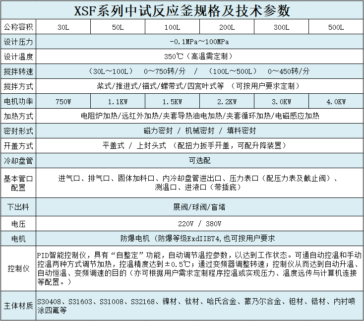 材質(zhì)一般有碳錳鋼、不銹鋼、鋯、鎳基(哈氏、蒙乃爾、因康鎳)合金等有色金屬及其它復(fù)合材料,加熱/降溫方式,可分為電加熱、熱水加熱、導(dǎo)熱油循環(huán)加熱、蒸汽加熱、遠紅外加熱、外(內(nèi))盤管加熱、電磁感應(yīng)加熱等,夾套降溫和釜內(nèi)盤管降溫等。加熱方式的選擇主要跟化學(xué)反應(yīng)所需的加熱/降溫溫度,以及所需熱量大小有關(guān)。攪拌器有錨式、框式、槳式、渦輪式,刮板式,組合式等多層復(fù)合槳。根據(jù)不同工作環(huán)境的工藝需要進行設(shè)計、制造。